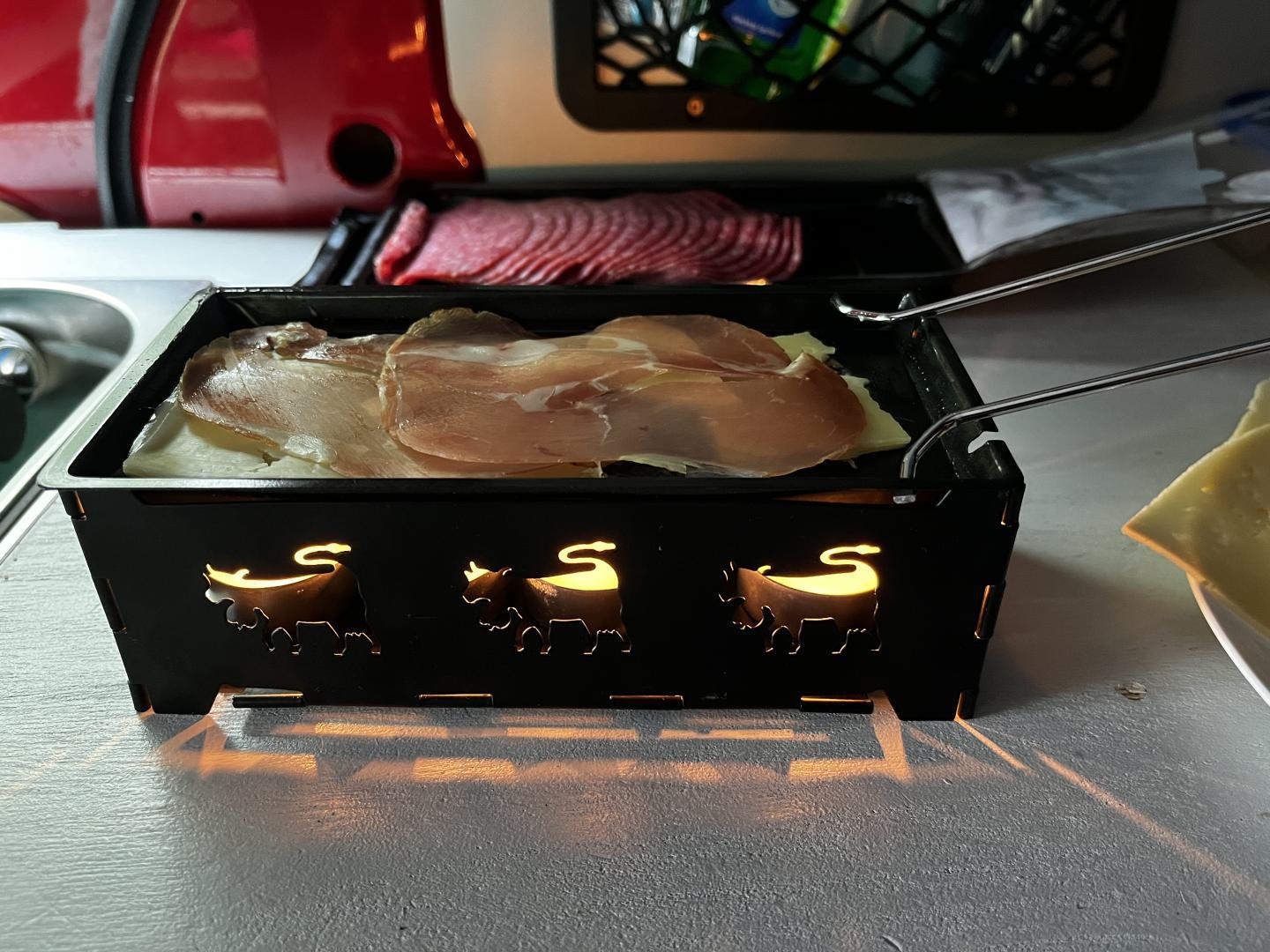 Mit Teelichtern betriebe Raclettes funktionieren im Camper an kühlen und verregneten Tagen überraschend gut.