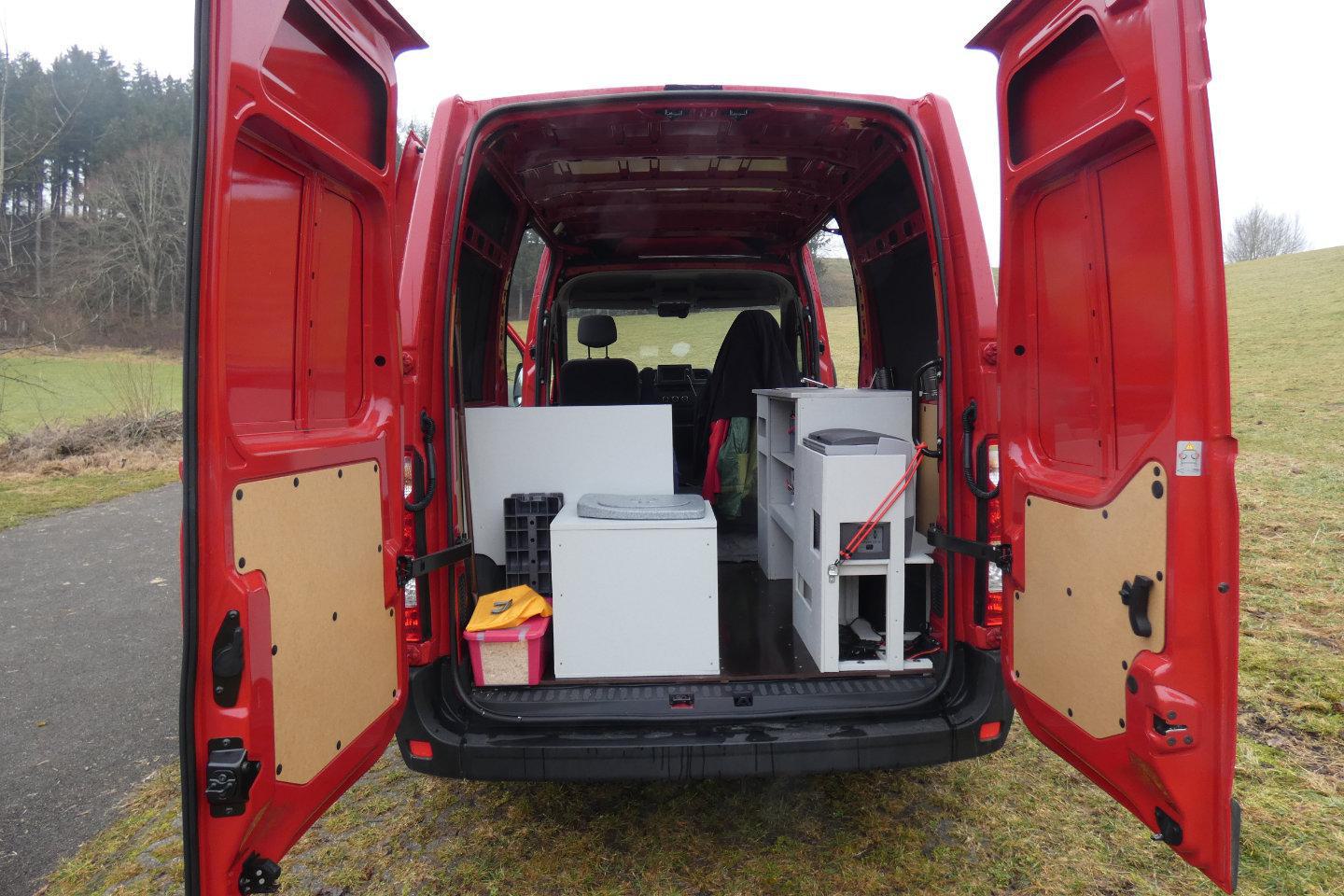 Jedes Modul ist sicher mit dem Boden verschraubt und der Küchenblock zusätzlich mit Spanngurten an Zurrösen an der Wand fixiert. Die Konstruktion so nun seit knapp einem halben Jahr im Auto untergebracht und hat bereits Vollbremsungen, Buckelpisten und einige tausend Kilometer normale Fahrt mitgemacht. Bisher ohne die geringsten Probleme.
