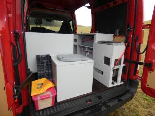 Das Küchenmodul auf der rechten Fahrzeugseite besitzt im Bereich der vorderen Schiebetür eine Spüle, darunter jeweils ein 12 Liter Frisch- und Abwasserkanister. Diese lassen sich bei geöffneter Schiebetür zum befüllen bzw. entleeren leicht von außen herausnehmen. Eine 12 V Pumpe befördert das Frischwasser dabei komfortabel über den Wasserhahn ins Spülbecken.