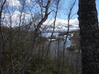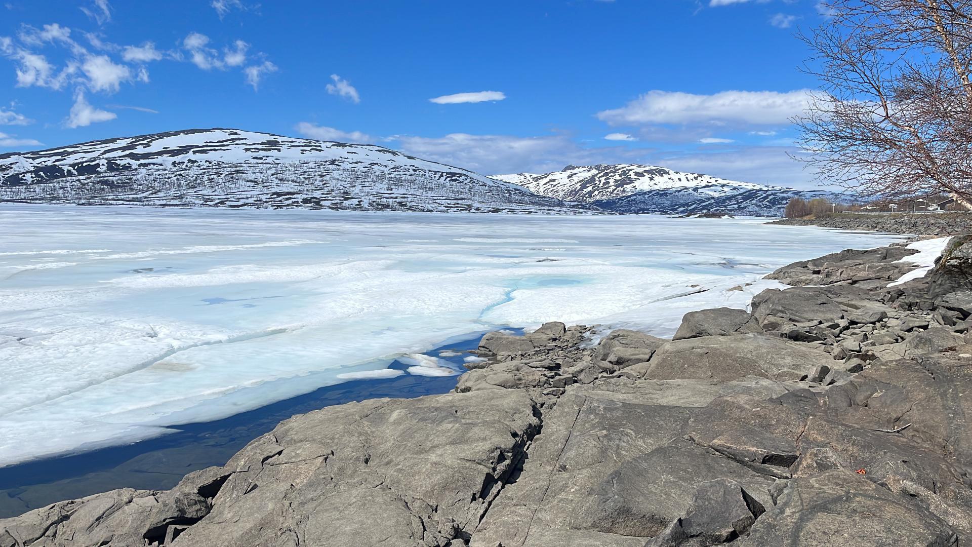 Also zurück zum Auto und weiter Richtung Norwegen. Immer entlang des Sees auf dem zu Beginn nur wenige Eisschollen getrieben sind, der sich jetzt aber unter einer fast geschlossenen Eisdecke versteckt und auch die Umgebung erinnert inzwischen mehr an den Winter, als an einen frühsommerlichen Tag Anfang Juni.