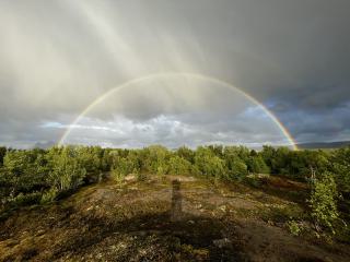 Irgendwann, Mitternacht ist nicht mehr fern, wird es plötzlich immer heller in meinem Camper. Das erste mal seit 2 Tagen zeigt sich die Sonne. Das Ganze auch noch in Verbindung mit einem gigantischen Regenbogen. Mehr noch, die langsam abziehenden Wolken sorgen dafür dass sich in meiner Umgebung immer mehr Berge zeigen. Kurz vor Mitternacht ein echter WOW-Effekt. So beschliesse ich die Gelegenheit zu nutzen und noch einen kleinen Nachtspaziergang zu unternehmen. In der Ferne entdecke ich dabei einen kleinen Leuchtturm, den ich mir Tag darauf noch aus der Nähe anschauen werde.