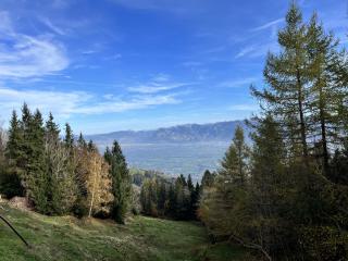 Also wird die Rheinseite einmal gewechselt, damit habe ich gleichzeitig die Schweizer Grenze passiert und nach der Durchquerung von Altstätten geht es hinauf auf den Ruppenpass. Mit einer Passhöhe von 1003m ist er nicht besonders hoch, aber immerhin reicht es, um auch dem letzten Nebeldunst zu entfliehen. Hier oben lege ich einen ersten längeren Zwischenstopp ein und nutze diesen für einen kleinen Spaziergang mit einer Wunderschönen Aussicht auf das Rheintal und den dahinter liegenden Österreichischen Berge.