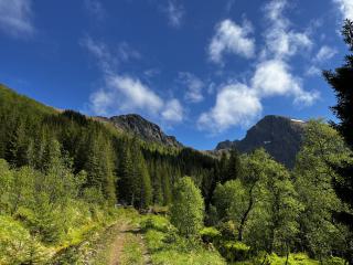Angesichts des guten Wetters beschliesse ich etwas planlos einfach mal die nähere Umgebung zu Fuß zu erkunden. Ein Waldweg führt mich in eines der umliegenden Täler. Langsam aber stetig geht es leicht Bergauf, vorbei an einem kleinen See und einem herrlichen Blick auf die Umliegenden Gipfel.