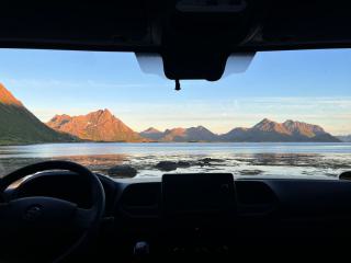 Von meinem Stellplatz aus habe ich einen herrlichen Blick über den kleinen Fjord und die umliegenden Berge. Während ich den Rest des Tages entspannt in und um meinen Camper verbringe, klart der Himmel mehr und mehr auf. Um Mitternacht ist so gut wie keine Wolke mehr zu sehen und die Umliegenden Bergen werden mit dem einzigartigen Licht der Mitternacht festlich in Szene gesetzt.