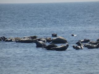 Leider war auch dieser Turm bei meinem Besuch geschlossen, eine defekte Tür verhindert den Aufstieg. Doch eine Menschengruppe die mit Ferngläsern scheinbar Felsen vor der Küste beobachten wecken mein Interesse. Wie ich beim Näherkommen feststellen muß bewegen sich die Felsen. Es handelt sich um eine Gruppe Seehunde, die einige Meter vor der Küste den sonnigen Tag geniessen. Aufgrund der recht großen Entfernung gelingen mir leider nur ein paar unscharfe Bilder, aber immerhin habe ich das erste mal frei lebende Seehunde zu Gesicht bekommen.