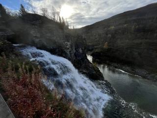 Etwa eine Stunde bin ich unterwegs bevor ich meinen nächsten Stop einlege. Am Harsprangsfallet, einem einst sehr eindrucksvollen Wasserfall mit einer Höhe von 75m. Durch den Bau eines Staudamms ist dieser heute jedoch komplett trockengelegt. Nur eine Info-Tafel erinnert daran welche Wassermassen hier einst in die Tiefe stürzten. Beeindruckend ist dieser Ort dennoch, den hier kann man sich anschauen was normalerweise unter den Fluten verborgen bleibt. Die Felsstrukturen und deren Färbung sind absolut beeindruckend.