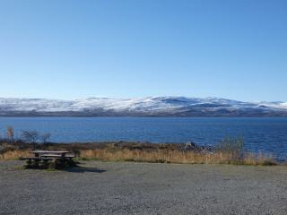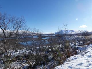 Schnell zieht es mich aber weiter, weiter in die Berge. Mit jedem Meter den ich an Höhe gewinne wird es winterlicher. Kurz vor der finnischen Grenze folgt dann der zweite Stopp für diesen Tag. Mit einem herrlichen Blick auf die winterliche Umgebung lege ich hier eine längere Pause ein. Ich geniesse ein frühes Mittagessen und kämpfe mit der Versuchung einem der Wege zu den noch nicht gefrorenen Seen zu folgen.