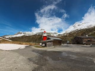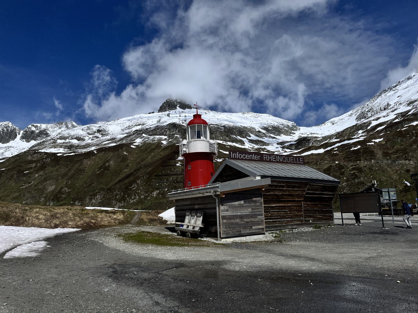 Unweit der Passhöhe liegen die Quellen des Rheins, weshalb man hier oben einen kleinen Leuchtturm gebaut hat, der dem an der einst an der Mündung des Rheins in die Nordsee gestanden hat nachempfunden ist.