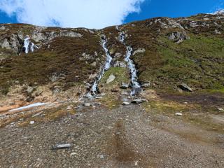 Oben auf der Passhöhe suche ich mir erst mal einen ruhigen Platz, etwas abseits vom Trubel. Hier gibt es erst mal etwas zum Frühstück. Danach geht es ein wenig auf Erkundungstour. Die Schneeschmelze ist hier oben noch in vollem Gange und das Schmelzwasser such sich seinen Weg über die Wiesen und Wege nach unten.