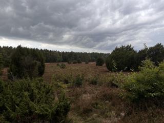 Am nächsten Morgen denke ich mir: Wenn ich schon einmal hier bin, muss ich auch eine kleine Runde durch die Lüneburger Heide drehen. Auch wenn sich die Temperaturen weiterhin auf einem hohen Niveau bewegen, ziehe ich meine Wanderschuhe an und starte meine Morgenrunde. Immerhin weht ein leichter Wind, der die Sache deutlich angenehmer macht als am Abend zuvor. Lange bin ich allerdings nicht unterwegs. Zum einen ist in der Ferne bereits das Donnern eines heranziehenden Gewitters zu hören, zum anderen zieht es mich langsam in kühlere Gefilde.