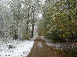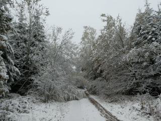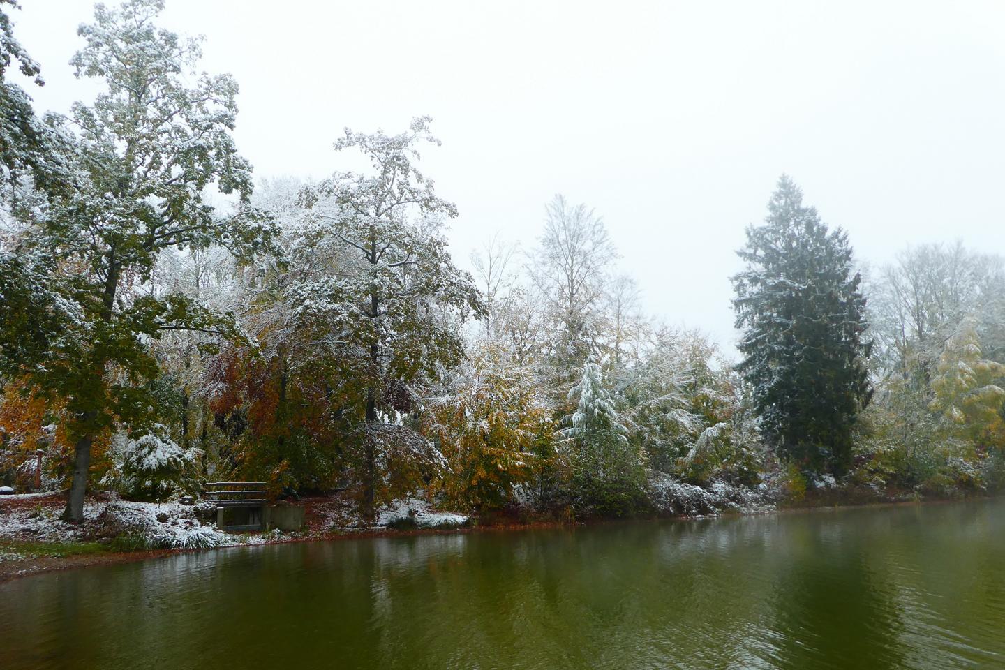 Nach dem scheinbar endlosen Sommer in diesem Jahr tragen viele der Bäume noch ein dichtes Laubkleid, was zusammen mit dem schweren Neuschnee dazu führt das ich einige Hindernisse auf dem Weg zum See umkurven muss.