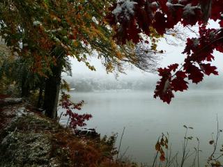 Der See empfängt mich mit Wind, der den Nebel über den See treibt, Schnee und leuchtend buntem Laub. Trotz des bescheiden Wetters eine beeindruckende Kombination, die mich einige Zeit am See verweilen lässt, bevor es schließlich wieder zurück in mein warmes Zuhause geht.