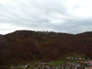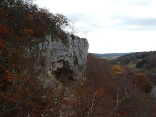 Von einem Wanderparkplatz geht es den Albtrauf entlang. Das Wetter ist zwar alles andere als optimal, immer wieder fällt Regen und anders als vorhergesagt reißt die Wolkendecke auch nicht auf. Mit Sonne währe es natürlich schöner, aber bei diesem durchwachsenen Herbstwetter habe ich zumindest nahezu alle Aussichtspunkte für mich alleine und kann sie in aller Ruhe genießen.