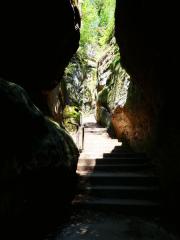 Zwischen den Felsen führen Treppen nach unten. Immer wieder geben Felsspalten den Blick ins Tal oder die Felsformationen frei. Ein sehr schöner Weg, dem ich allerdings nicht bis ganz nach unten folge. Auf etwa halber Höhe gibt es nochmals einen sehr schönen Aussichtspunkt.