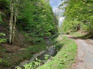 Entlang eines kleinen Baches, der auf seinem Weg ins Tal vom kleinen Rinnsal immer weiter anwächst, geht es talwärts. Der Bach in zusammenspiel mit dem frischen Frühlingsgrün der Bäume machen auch diesen Abschnitt der Wanderung zu etwas ganz besonderem.