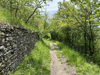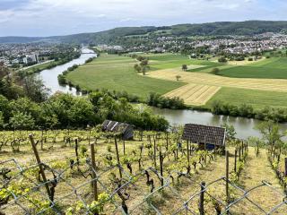 Durch den Wald geht es zunächst steil nach oben, bevor der Weg rechts in die ehemaligen Weinberge abbiegt. Von hier aus kann man immer wieder traumhafte Ausblicke in Neckartal, die umliegenden Ortschaften und das stillgelegte Kernkraftwerk Obrigheim erleben.