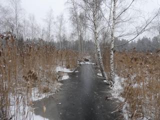 Am 6. Januar sorgt Schneefall schließlich endlich für echtes Winterfeeling. Bereits am Morgen breche ich an diesem Feiertag auf um eine kleine Wanderung durchs Wurzacher Ried zu unternehmen. Ausgangspunkt ist das Oberschwäbische Torfmuseum. Im Sommer kann man von hier aus, das Ried mit der Torfbahn erkunden. Jetzt, Anfang Januar, noch dazu bei trübem Wetter mit Schneefall ist hier am frühen morgens nichts los. Mein Weg führt mich vorbei am Stuttgarter See, durch einen Waldabschnitt und schließlich über einen Bohlenpfad bis ins nahegelegene Haidgau. Das braune Schilf, das schwarze Moorwasser und der frische Neuschnee bilden dabei beeindruckende Kontraste.