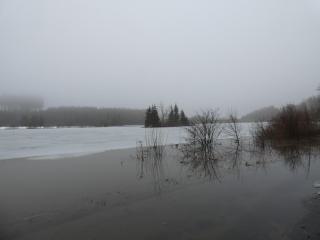 Der Januar verabschiedet sich schließlich mit Tauwetter. Kräftiger Regen, milde Temperaturen und Wind lassen die teilweise über 50 cm dicke Schneedecke innerhalb von nur 2 Tagen dahinschmelzen. Das Ergebnis sind viele überschwemmte Wiesen und Felder. Mein letzter kleiner Ausflug des Monats führt mich schließlich zum Hochwasserrückhaltebecken Rappenbach. Normalerweise führt ein recht komfortabler Weg um den See, aber nachdem der Pegel des Sees gut einen Meter über normal liegt, steht der größte Teil davon unter Wasser. Die Umrundung des Sees ist mir aber dennoch gelungen. Auch wenn es zum Schluss ein paar nasse Füße gab.