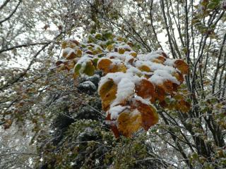 Nach dem scheinbar endlosen Sommer in diesem Jahr tragen viele der Bäume noch ein dichtes Laubkleid, was zusammen mit dem schweren Neuschnee dazu führt das ich einige Hindernisse auf dem Weg zum See umkurven muss.