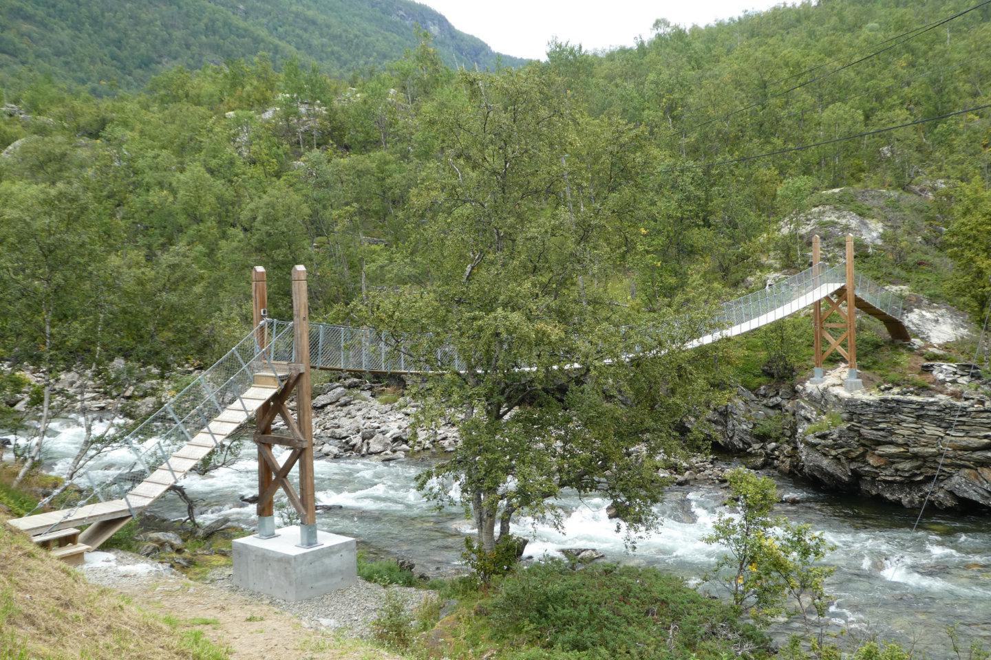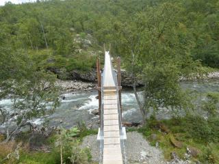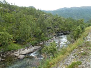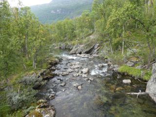 Abgesehen von einem kleinen Bach den es ohne Brücke über ein paar große Steine zu überwinden gilt ist der Weg sehr einfach zu begehen. Ein gepflegter und wohl regelmäßig gemähter Grasweg der durch einen Birkenwald ins Tal führt. Abgesehen von 2 älteren Damen treffe ich hier niemanden. Es herrscht wiedereinmal diese einzigartige Ruhe die ich in Norwegen so sehr liebe. Heute habe ich es nicht eilig, es geht nicht darum eine große Strecke hinter sich zu bringen oder irgendwo ankommen zu müssen.